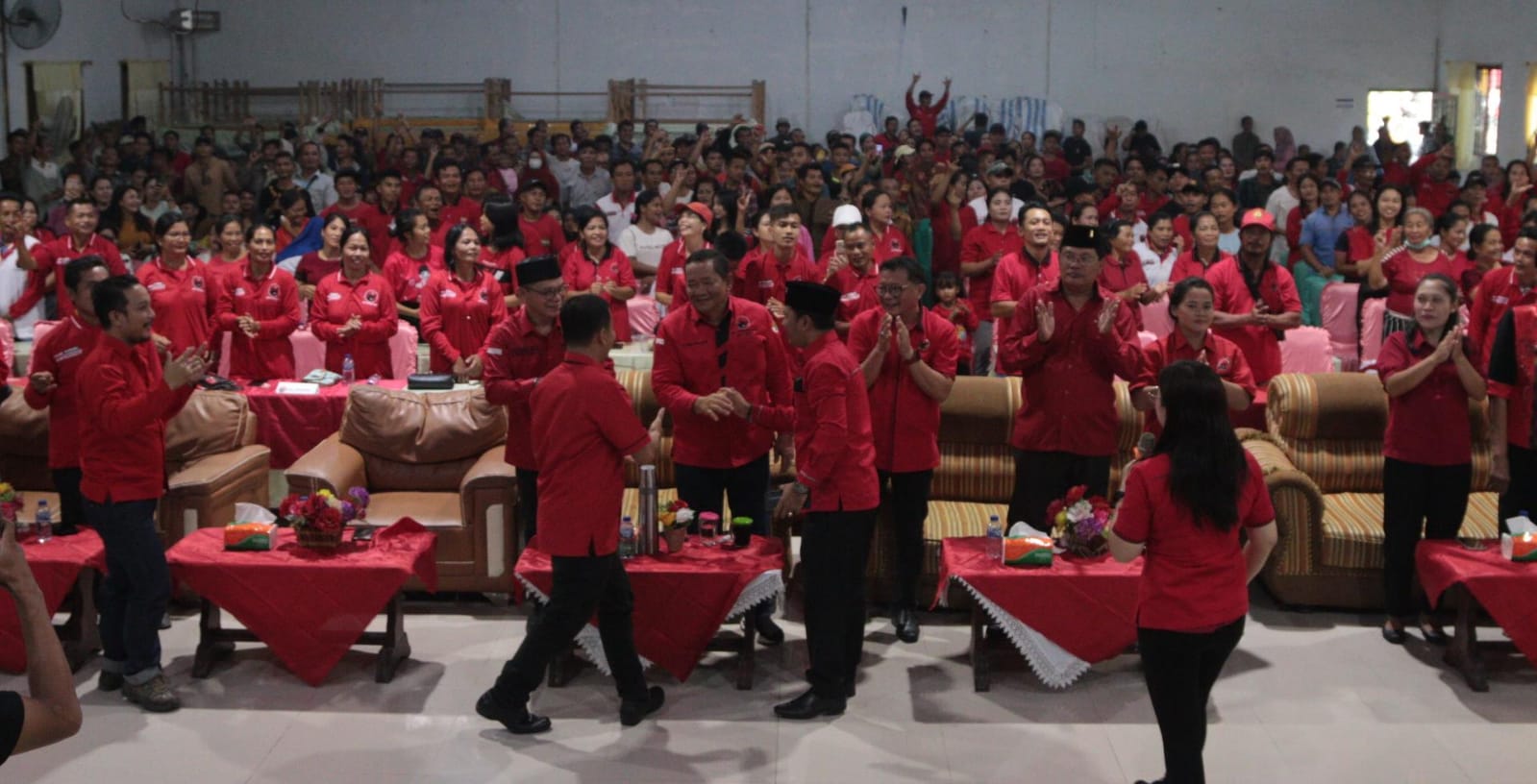 Semangat Ratusan kader PDI Perjuangan DPC Nias Barat menggelora menyambut kedatangan Ketua DPD PDI Perjuangan Sumut Drs Rapidin Simbolon MM di Halll.