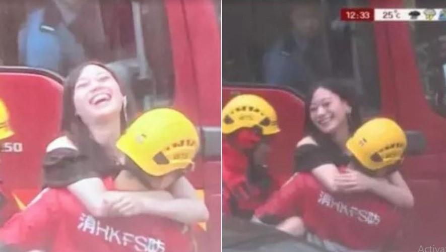 Wanita itu kemudian melingkarkan lengannya di leher petugas pemadam kebakaran, tanpa rasa sungkan.