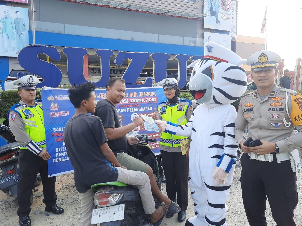 TRIBUN-MEDAN.com, LABUHANBATU - Kasatlantas Polres Labuhanbatu melakukan penyebaran brosur serta stiker di Jalan Sisingamangaraja, Rantauprapat, Kabupaten Labuhanbatu persis di depan Suzuya Mall Rantauprapat.