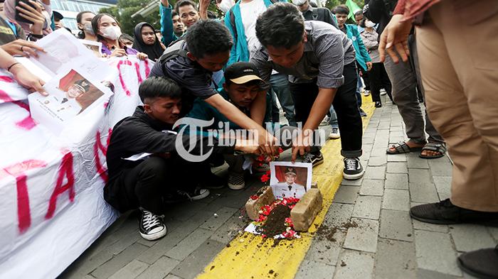 TRIBUN-MEDAN.com, MEDAN - Sejumlah anggota Aliansi Badan Eksekutif Mahasiswa Seluruh Indonesia (BEM-SI) melakukan aksi mengubur foto Bobby Nasution di depan Kantor Wali Kota Medan, Selasa (3/10/2023).