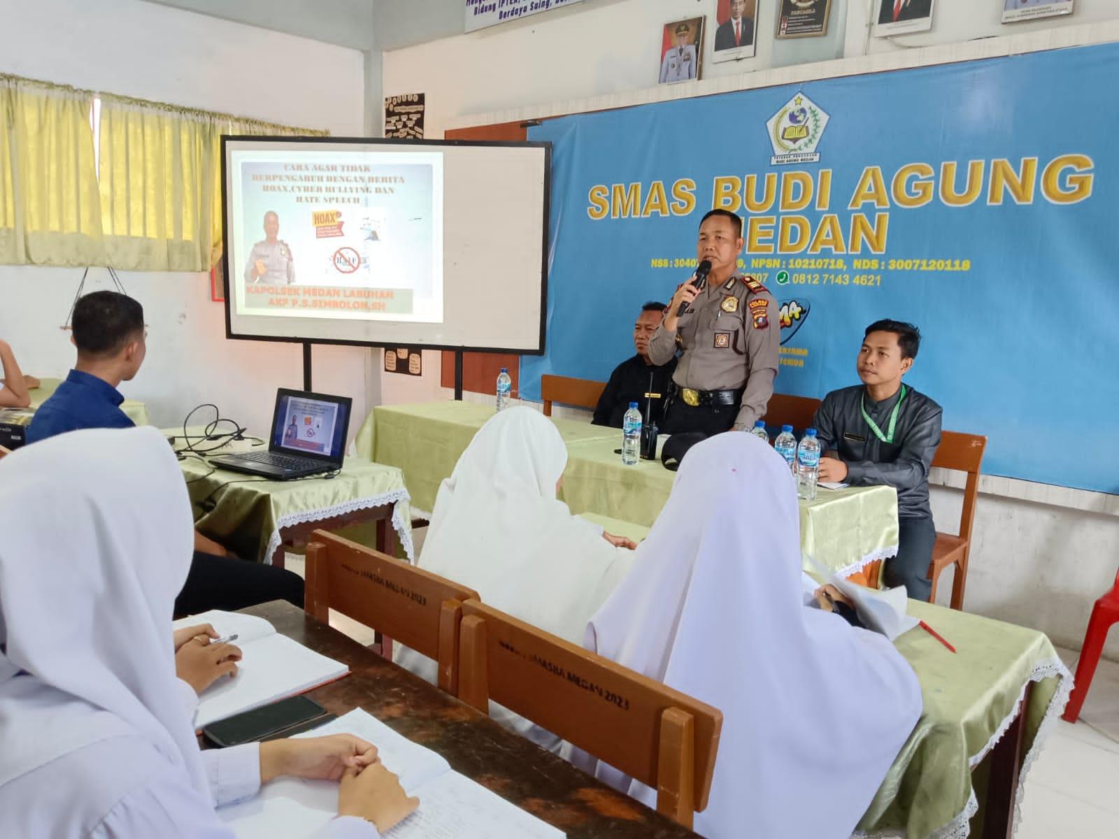 Kapolsek Medan Labuhan, AKP PS Simbolon, mengadakan sesi penyuluhan kamtibmas di SMA Swasta Budi Agung Medan. Selasa (3/10/2023).