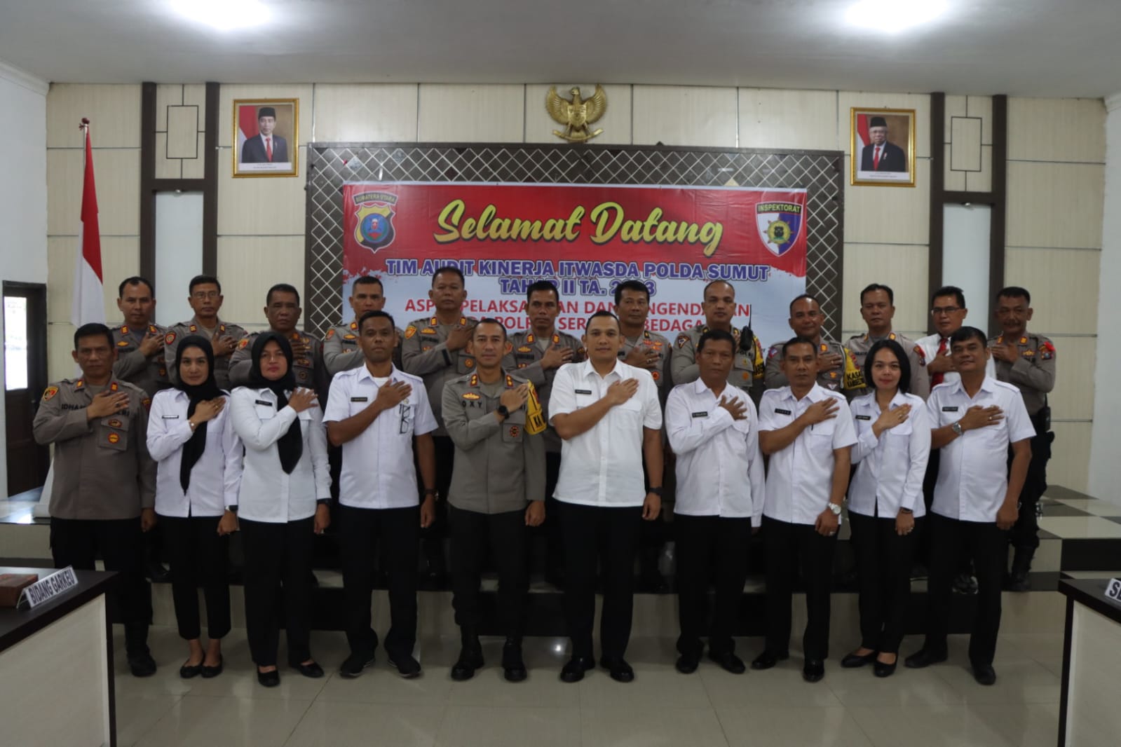 TRIBUN-MEDAN.COM, SERGAI-Kapolres Serdangbedagai (Sergai), AKBP Oxy Yudha Pratesta SIK melalui Kasi Humas Ipda Brimen, SH, MH, menjelaskan kegiatan Polres Sergai menerima Tim Audit Kinerja Itwasda Polda Sumut dipimpin AKBP Ronny N Sidabutar SH SIK MH, Senin (23/10/2023) di Aula Patriatama Polres Sergai di Seirampah.