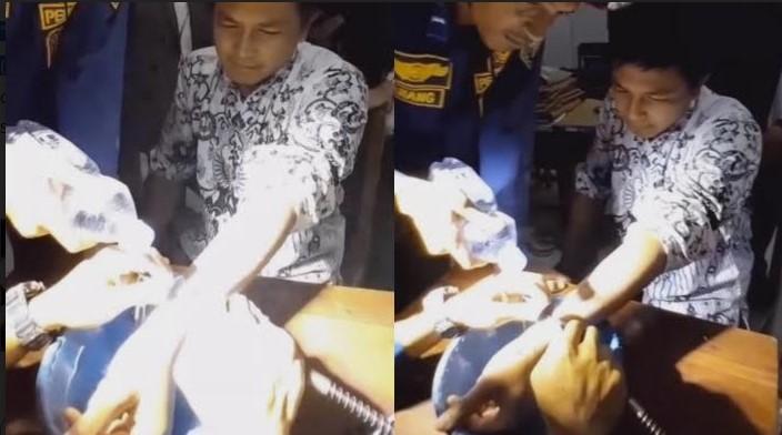 Dalam video tersebut, tampak sejumlah petugas damkar bekerjasama melepas borgol dari tangan guru tersebut.