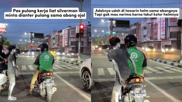 Dalam video yang beredar, sosok driver ojol itu terlihat membantu bocah yang mencari uang dengan menjadi manusia silver.