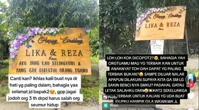 Adapun pesan menohok yang tertulis di karangan bunga tersebut ialah "Happy Wedding Lika dan Reza, from (dari) aku yang kau selingkuhi dan yang gak direstui orangtuamu".