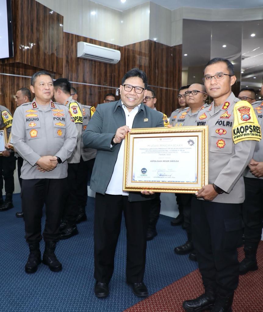 Kapolres Sibolga AKBP Taryono Raharja, SH SIK MH secara simbolis menerima Penghargaan Penganugerahan Predikat Penilaian Kepatuhan Penyelenggaraan