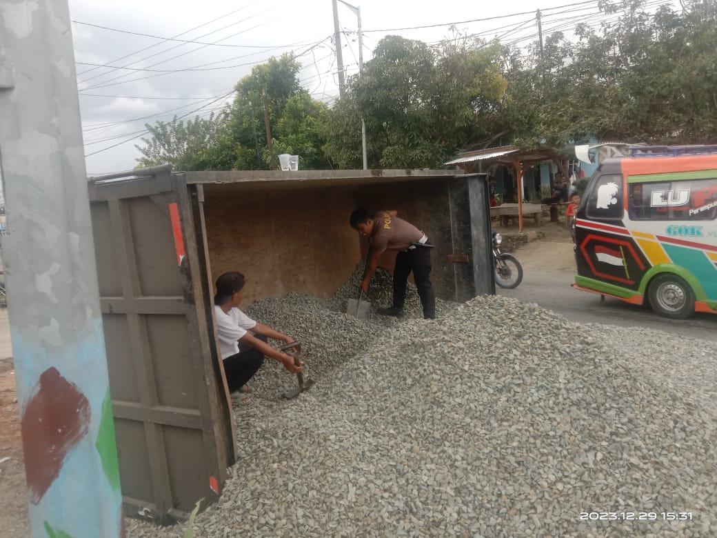 Setelah Menerima laporan dari masyarakat, personil Sat Lantas unit Gakkum cepat respon dengan langsung mendatangi lokasi kejadian kemudian membantu membersihkan muatan batu kerikil serta evakuasi material truk cold diesel tersebut.