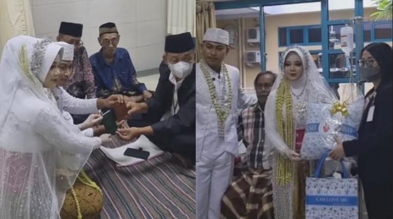 Tampak pengantin pria melangsungkan akad nikah di hadapan ayah pengantin wanita yang sedang terbaring di atas ranjang rumah sakit.