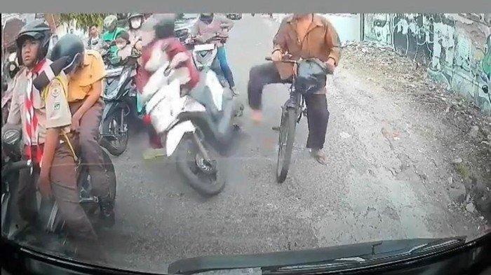 Pria yang belum diketahui identitasnya ini tampak mengendarai sepeda dan menendang pengendara motor hingga tersungkur ke jalan.