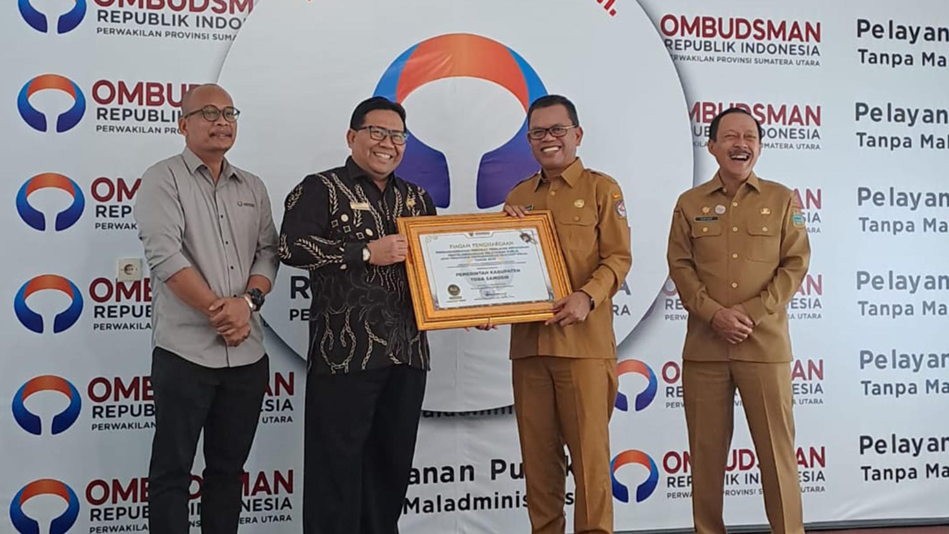 Piagam Penghargaan diterima langsung oleh Bupati Toba, Poltak Sitorus, dari Pimpinan Ombudsman RI, Dadan Suparjo Suharmawijaya, didampingi Pjs. Kepala Perwakilan Ombudsman RI Provinsi Sumatera Utara, James Marihot Panggabean, dan Sekdaprov Sumut Arief S Trinugroho, pada Selasa (23/1/2024) bertempat di Kantor Ombudsman RI Perwakilan Provinsi Sumatera Utara, Jalan Asrama nomor 18 Medan.