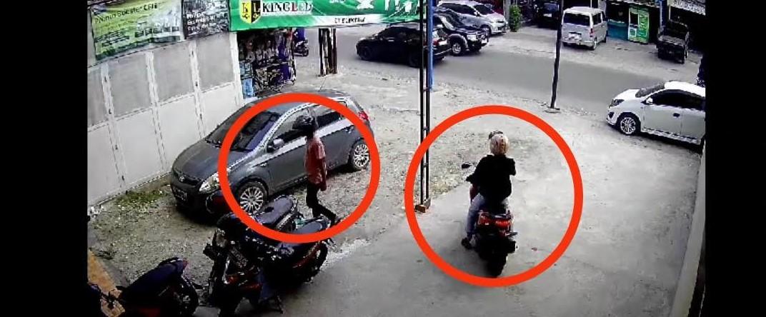 Dua orang pria terekam kamera pengawas CCTV, mencuri satu unit sepeda motor Honda Scoopy yang sedang terparkir.