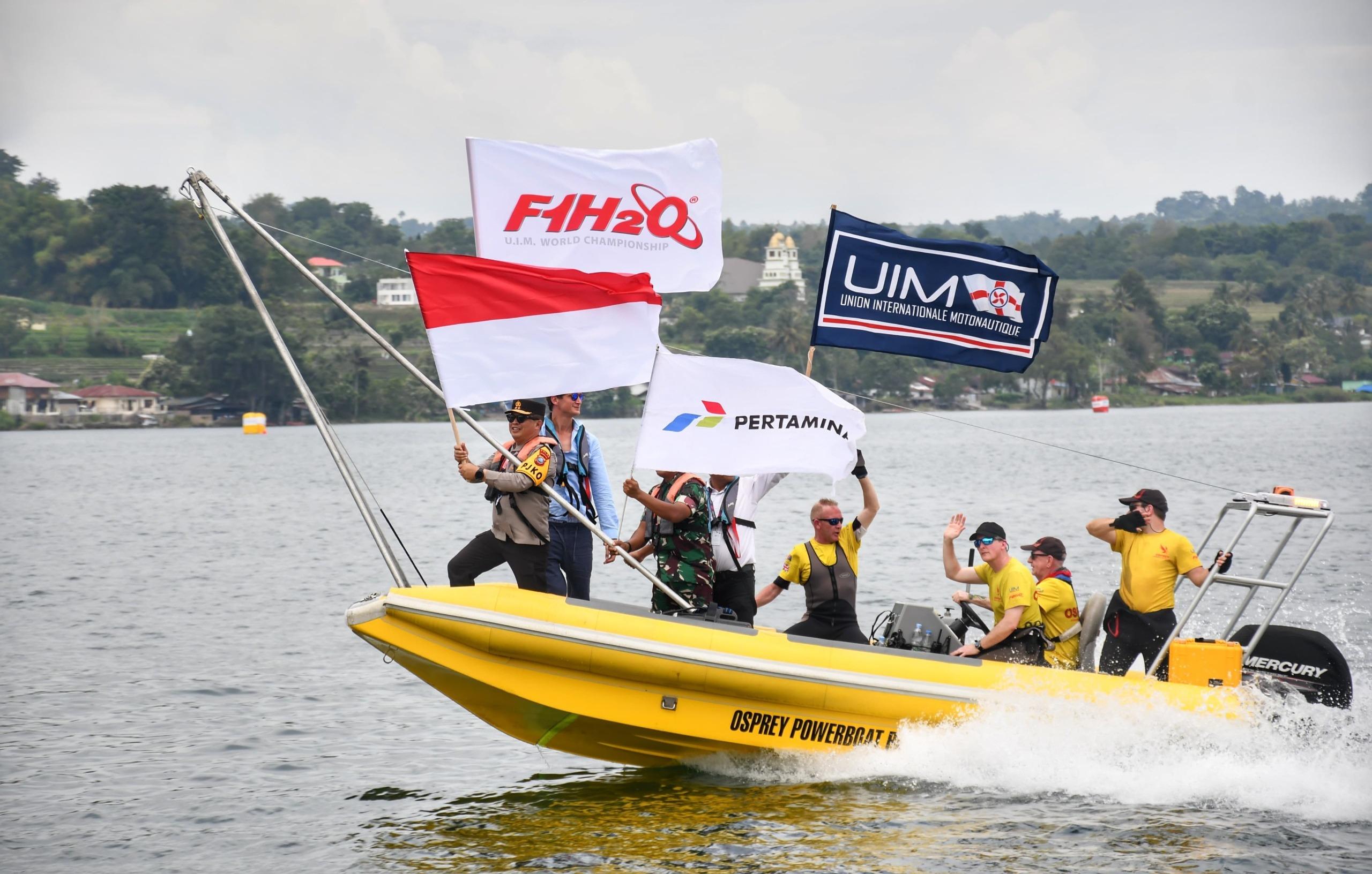 Dengan menggunakan boat milik penyelenggara F1 Powerboat, Kapolda Sumut mengitari lintasan balapan sembari mengibarkan Bendara Merah Putih.