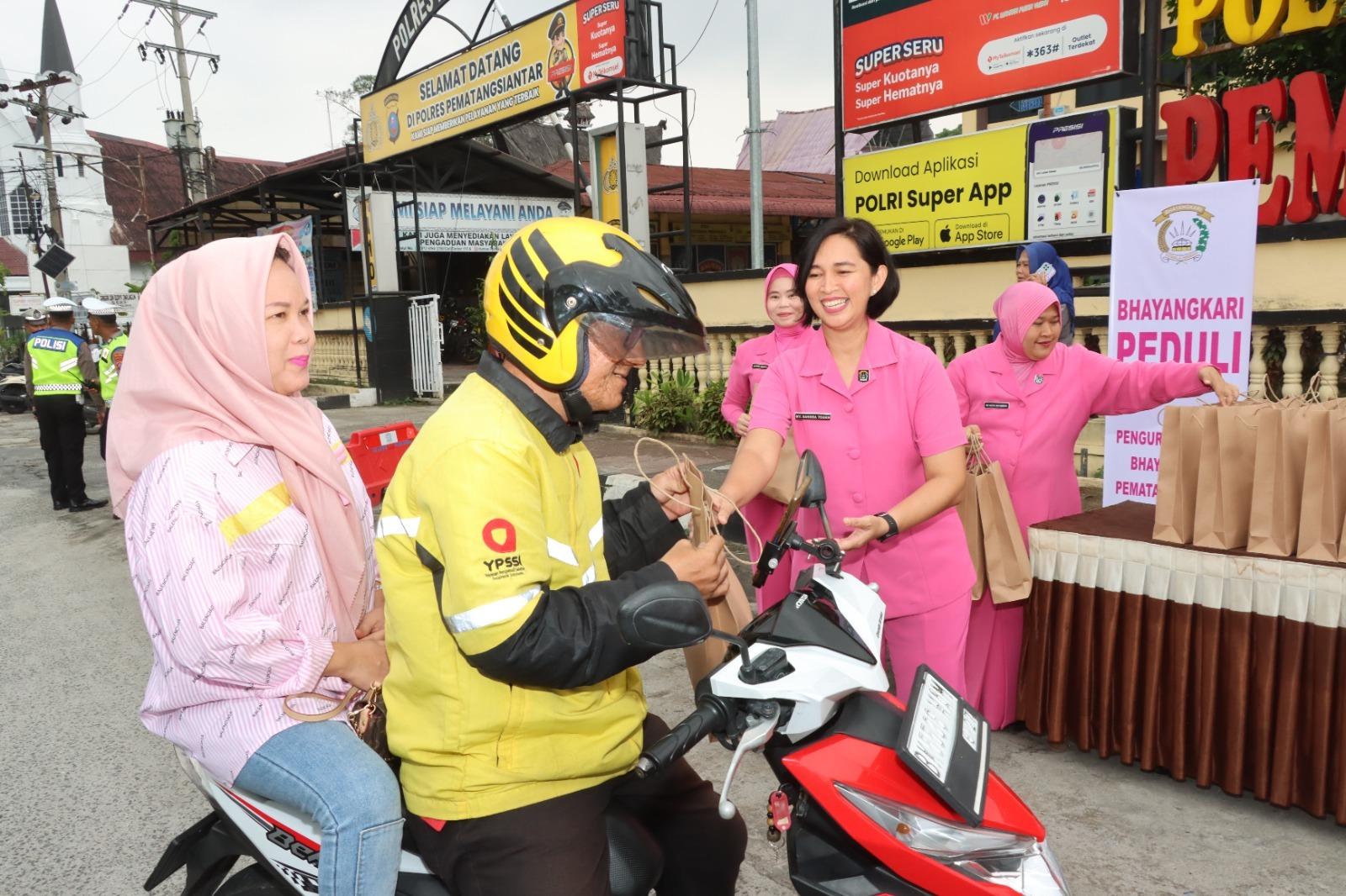 Ketua Bhayangkari Cabang Pematangsantar Ny Sandra Yogen beserta pengurus membagikan makanan berbuka puasa berupa takjil secara gratis
