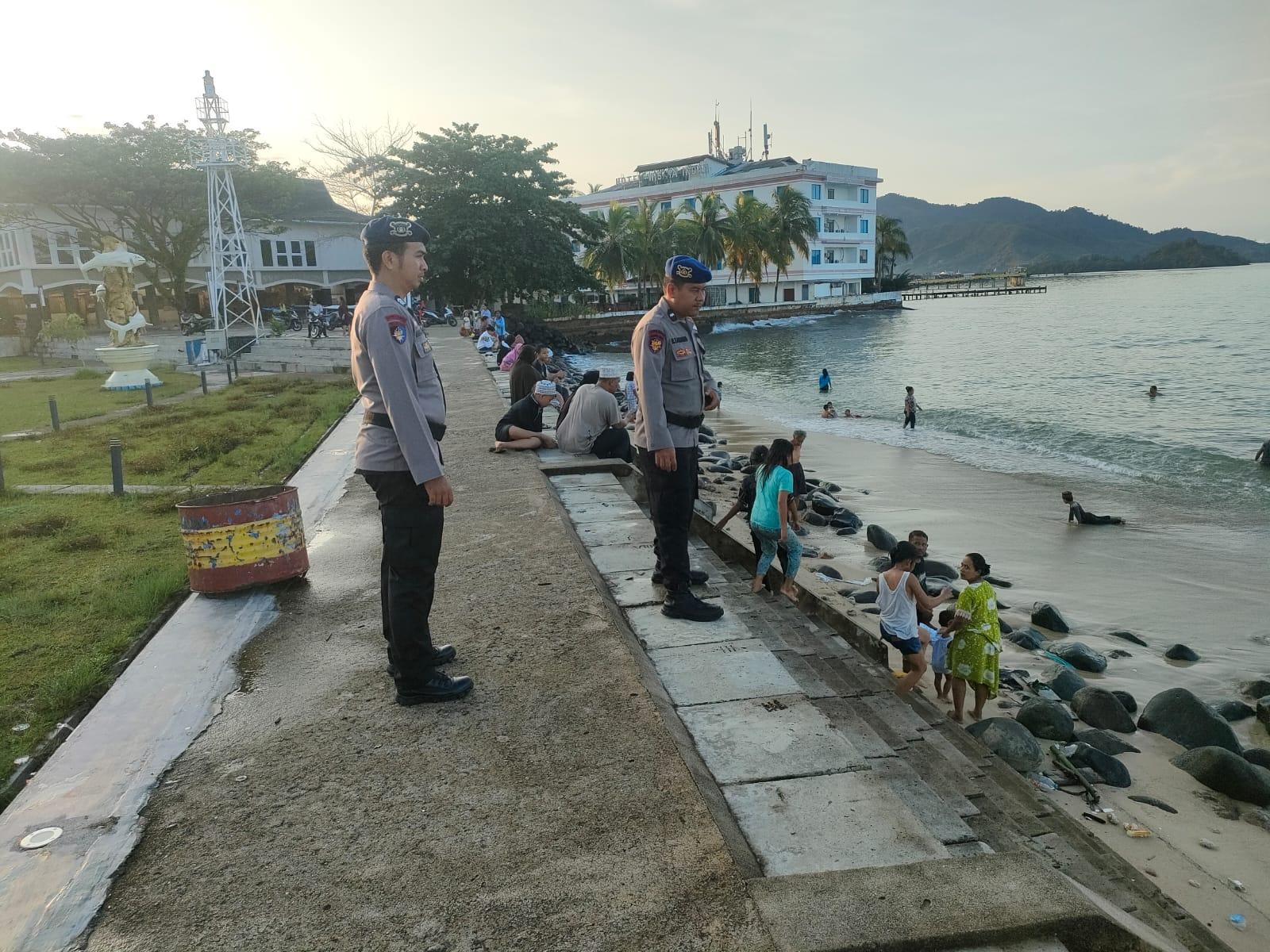 TRIBUN-MEDAN.com, SIBOLGA - Personel Sat Polairud Polres Sibolga melakukan pengamanan terhadap masyarakat pengunjung objek wisata Pelabuhan Lama Sibolga yang sedang melakukan aktivitas mandi-mandi di pinggir pantai, dalam Ops Ketupat Toba 2024, Minggu (07/04/2024), Pukul 16.00 Wib sampai Pukul 18.00 Wib.