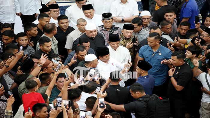 TRIBUN-MEDAN.com, MEDAN - Presiden Republik Indonesia, Joko Widodo, melakukan salat Jumat di Masjid Agung Medan, Jalan Pangeran Diponegoro, Kelurahan Madras Hulu, Kecamatan Medan Polonia, Kota Medan, Jumat (12/4/2024).