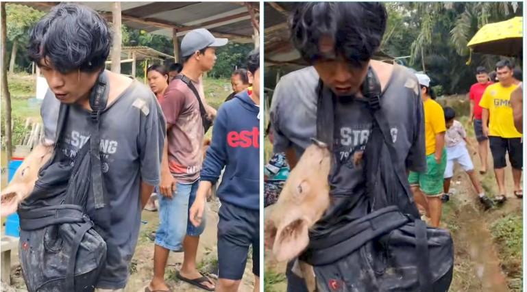 Aksi pemuda yang belum diketahui identitasnya ini pun beredar di media sosial instagram. Ia tampak menggendong seekor anakan babi menggunakan sebuah tas ransel yang dipakai di dada.