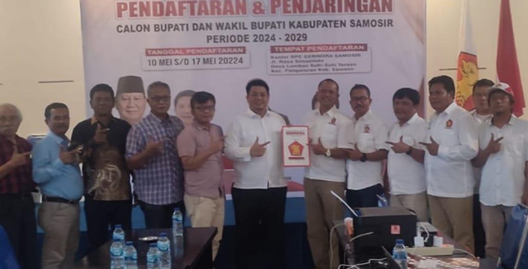 Bakal calon (bacalon) bupati Samosir Vandiko Gultom mendaftarkan diri ke Partai Gerindra. Ini adalah partai terakhir yang disambangi Vandiko Gultom