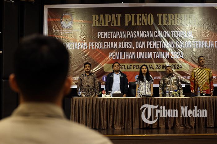 TRIBUN-MEDAN.com, MEDAN - KPU Medan menggelar rapat pleno yang dihadiri oleh perwakilan seluruh partai di Hotel Le Polonia, Medan, Selasa (28/5/2024). Rapat pleno terbuka tersebut menetapkan pasangan calon terpilih, menetapkan perolehan kursi dan menetapkan calo terpilih dalam pemilihan umum 2024.