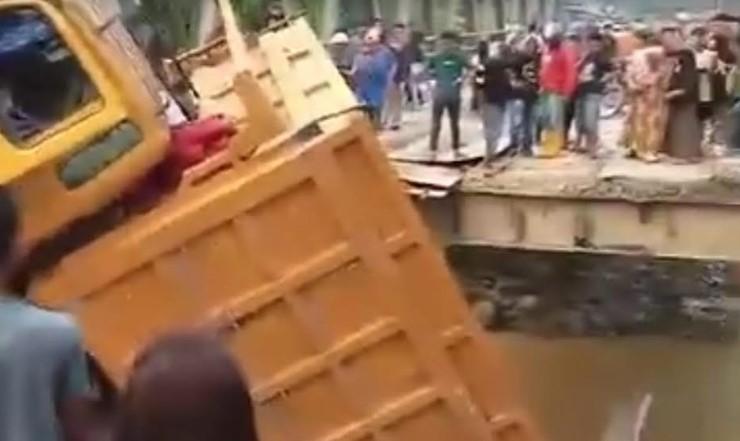 Jembatan yang sudah bertahun-tahun rusak ini, ambrol saat satu unit truk bermuatan material pasir dan batu dari galian C dengan tonase besar tengah melintas.