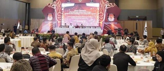Rapat koordinasi berlangsung di Medan, Jumat (21/6/2024). Rapat dipimpin Ketua KPU Sumut Agus Arifin Siregar dan dihadiri perwakilan partai politik dan juga sejumlah lembaga pemerintahan di Sumut.