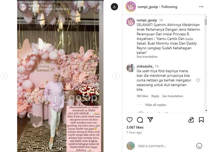 Di unggahan itu, Aisyahrani menyebut bahwa anak Syahrini itu berjenis kelamin perempuan.