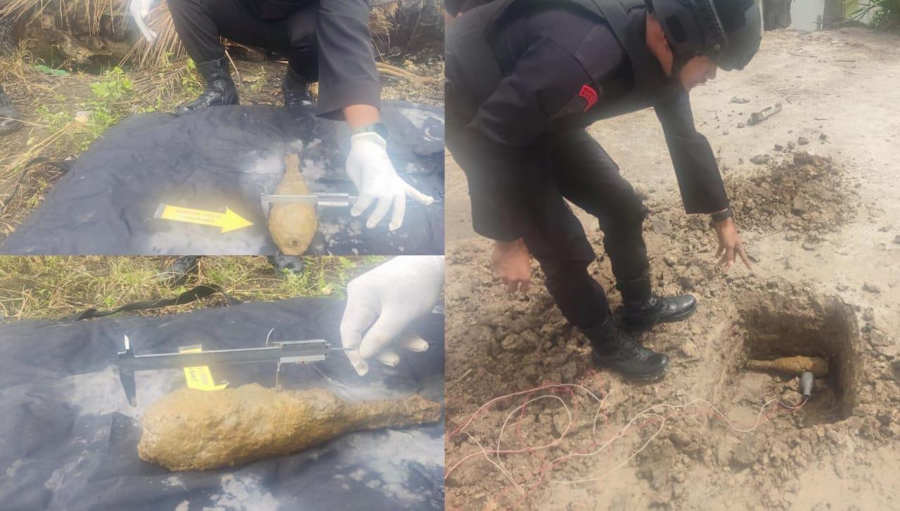 Setelah memastikan area aman, tim melanjutkan dengan pemeriksaan mendetail terhadap bom mortir tersebut sebelum akhirnya melaksanakan disposal atau penjinakan dengan cara yang aman dan sesuai prosedur.