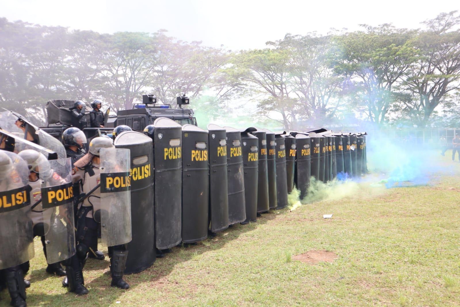 Latihan simulasi mencakup berbagai skenario, termasuk penanganan demonstrasi massa dengan taktik pengendalian massa dan penggunaan peralatan khusus Brimob.