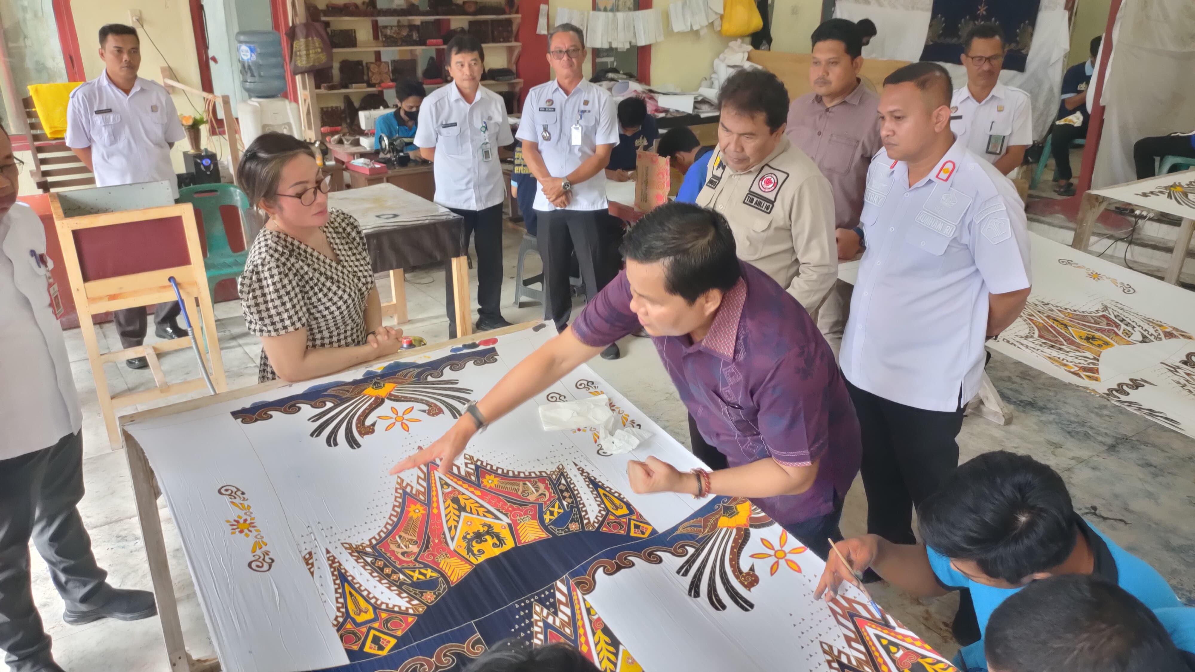 Kunjungan ini berlangsung di ruang kemandirian Batik Lapas Gunungsitoli Kanwil Kemenkumham Sumatera Utara, di mana kegiatan pembuatan batik tulis oleh warga binaan dilaksanakan.