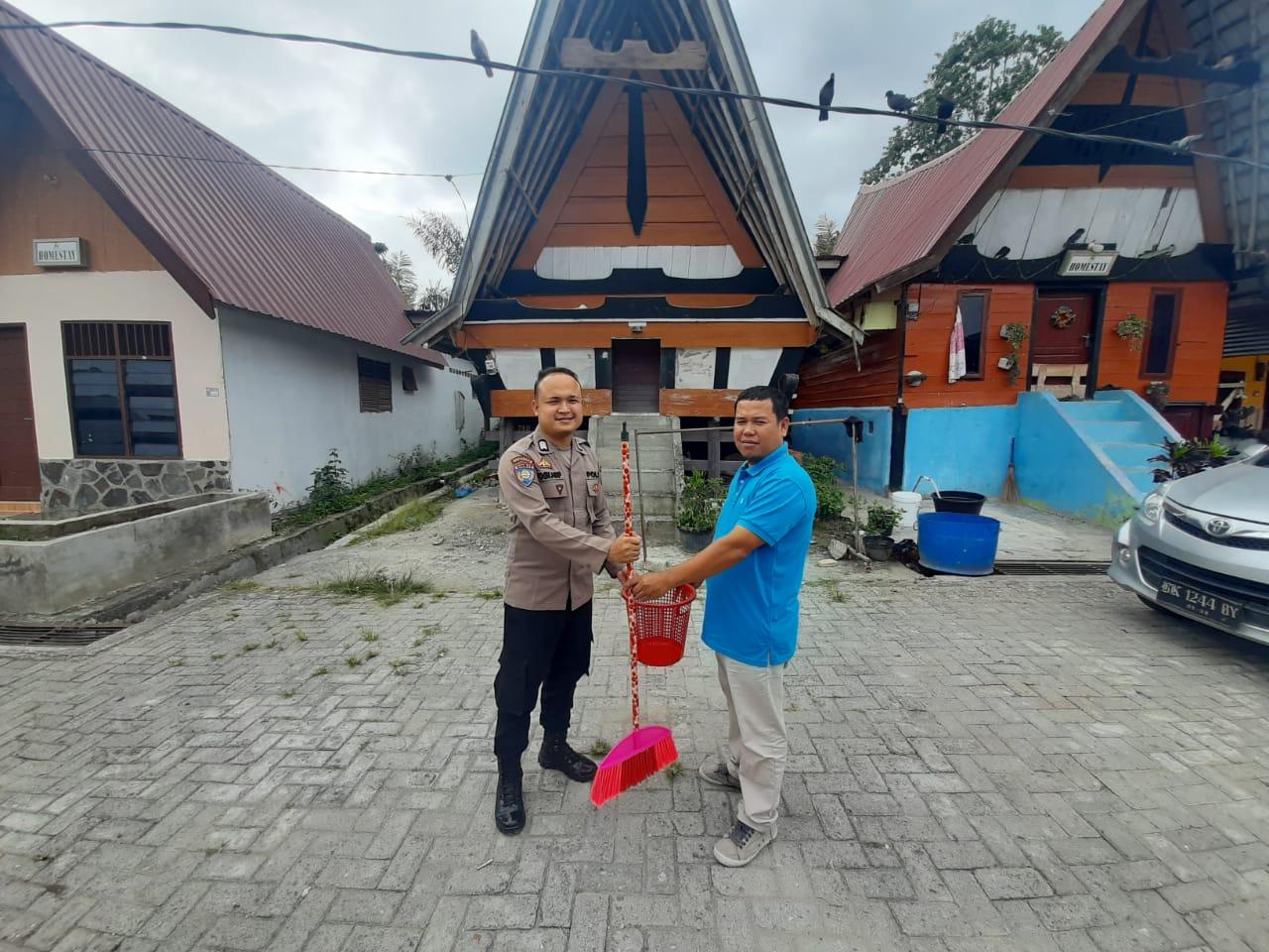 Brigadir Polisi Yogi Harahap dan Brigadir Polisi Satu Jefta Siantur dari Sat Binmas Polres Samosir menyerahkan sarana kontak berupa alat kebersihan kepada masyarakat di Desa Parsaoran I dan Kelurahan Pasar Pangururan.