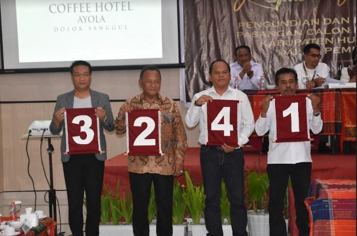 Setelah dilakukan berbagai tahapan hingga penetapan, keempat pasangan calon (paslon) mencabut nomor urut di KPUD Humbahas