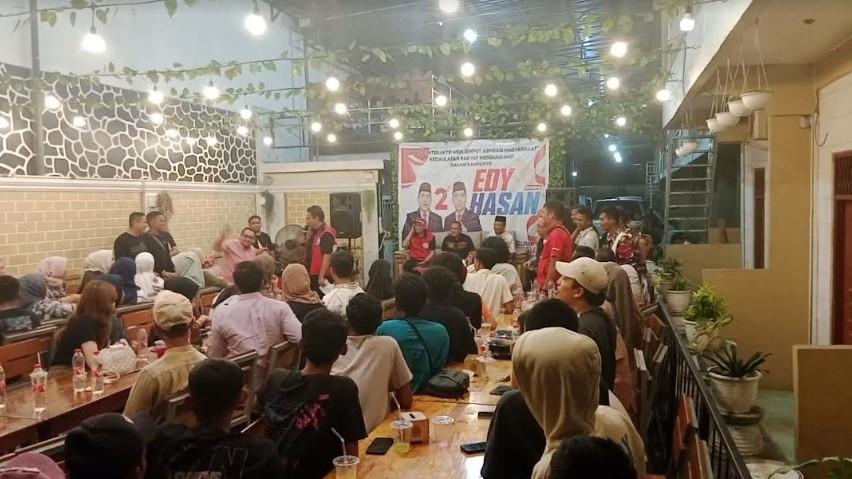 Edy menjamu pendukung dan simpatisan Asahan di Barbara Cafe, Jalan Diponegoro, Kisaran Barat, Kabupaten Asahan, Rabu (23/10/2024).