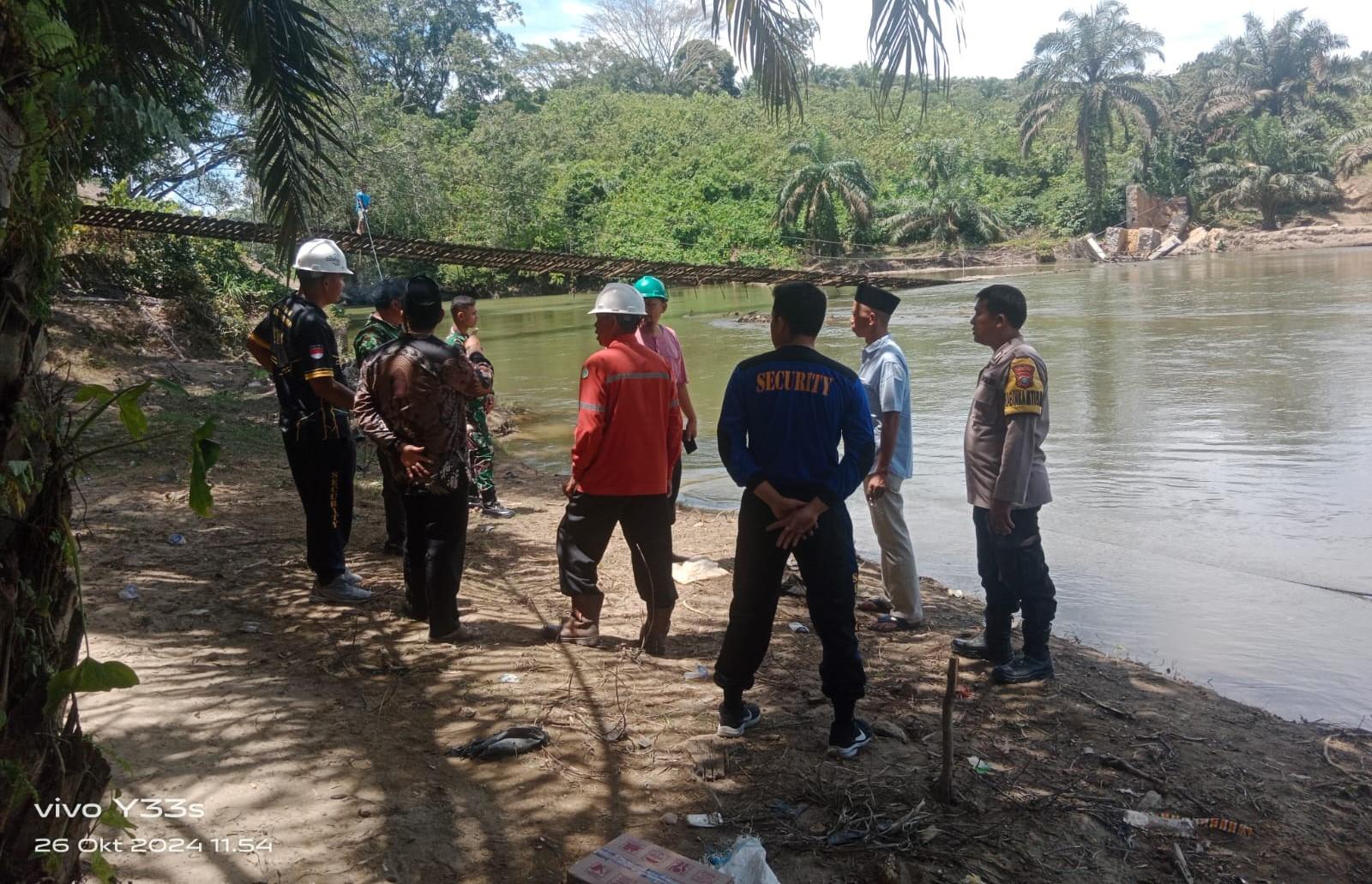 TRIBUN-MEDAN.com, PADANGLAWAS - Bhabinkamtibmas Polsek Barumun, Polres Padanglawas, Bripka Zulkifli Hasibuan bersama dengan Camat Lubuk Barumun dan Asisten Tehnik PT. VAL Huta Lombang melaksanakan pengecekan putusnya jembatan gantung yang diakibatkan longsornya pondasi penahan jembatan, Sabtu (26/10/2024).