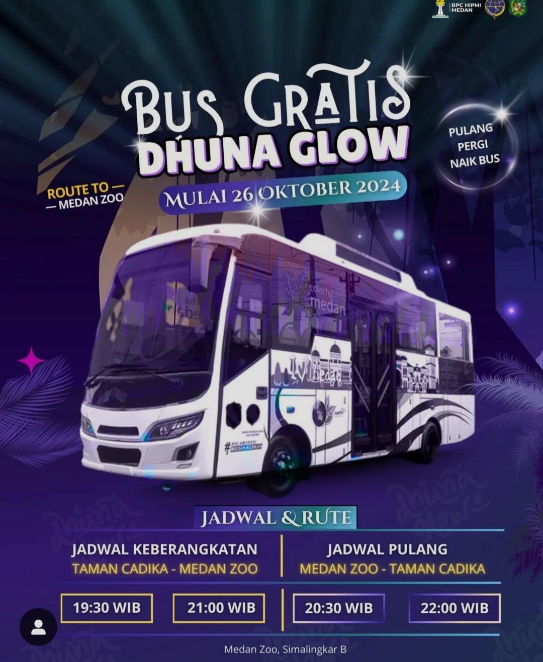 "Ini gratis ya. Jadi masyarakat yang mau ke Medan Zoo untuk melihat tempat wistaa Dhuna Glow bisa langsung ke Taman Cadika. Jadi, enggak perlu naik kendaraan pribadi lagi ke sana,"tuturnya.