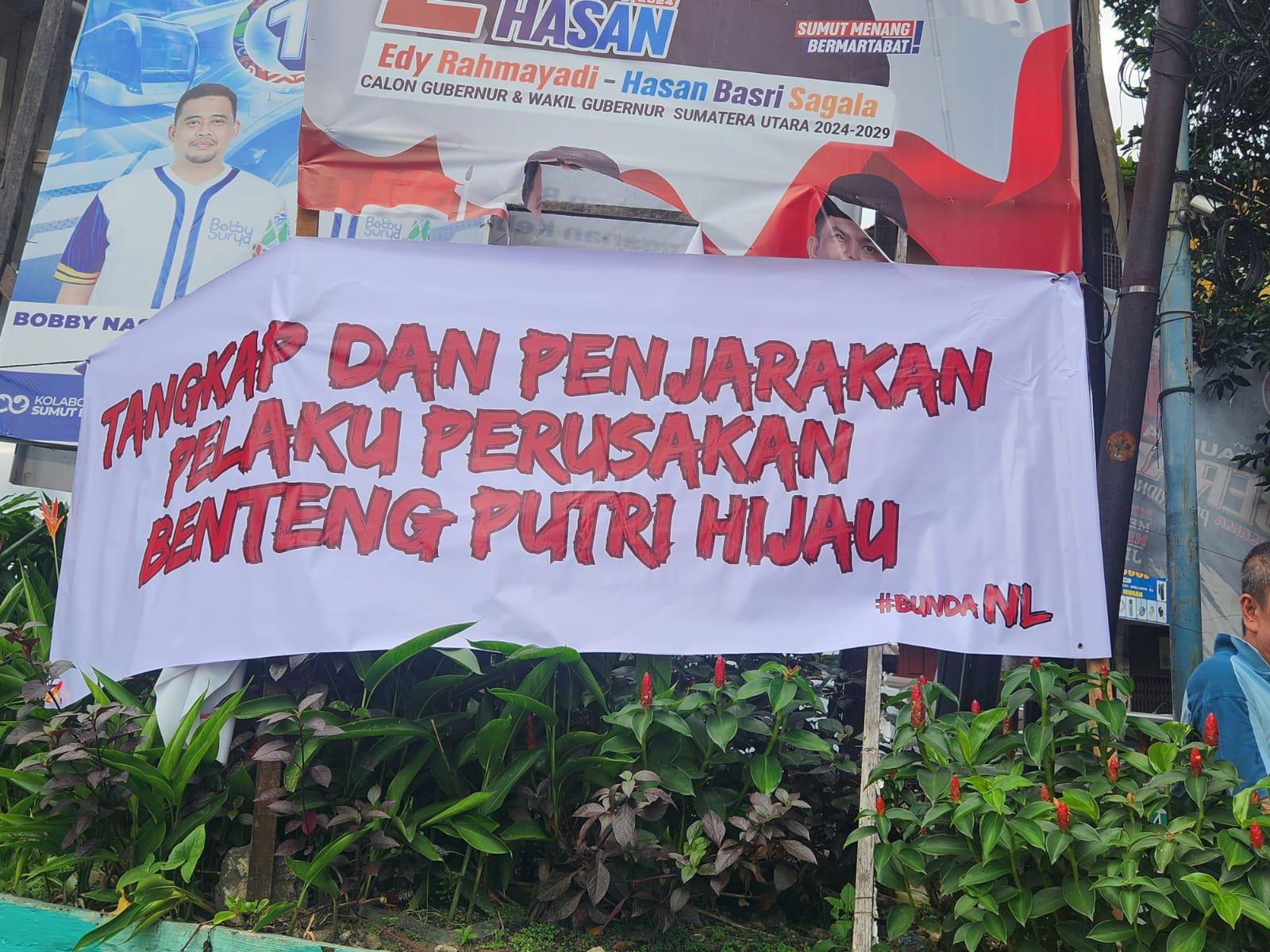 Sejumlah spanduk bertuliskan tangkap dan penjarakan pelaku perusakan Benteng Putri Hijau muncul di Kota Medan. Spanduk itu muncul di beberapa ruas