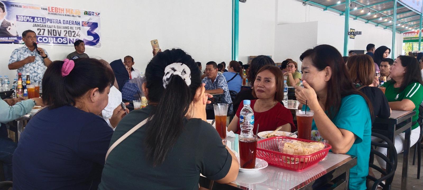TRIBUN-MEDAN. com, LUBUKPAKAM- Calon Bupati Deli Serdang nomor urut 3, M Ali Yusuf Siregar bersilaturahmi dengan puluhan emak-emak etnis Thionghoa di Warkop Agam 2 Jln Diponegoro Lubuk Pakam, Senin (18/11/2024). Saat itu sesekali Yusuf pun menggunakan bahasa Thionghoa.
