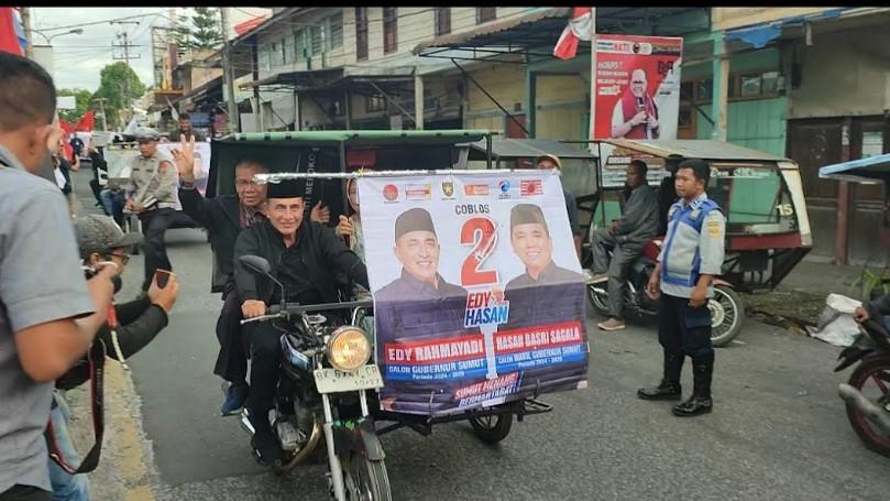 Tak mau kalah, Calon Bupati Dairi nomor urut 2, Eddy Keleng Ate Berutu juga tampak mengendarai becak bermotor.
