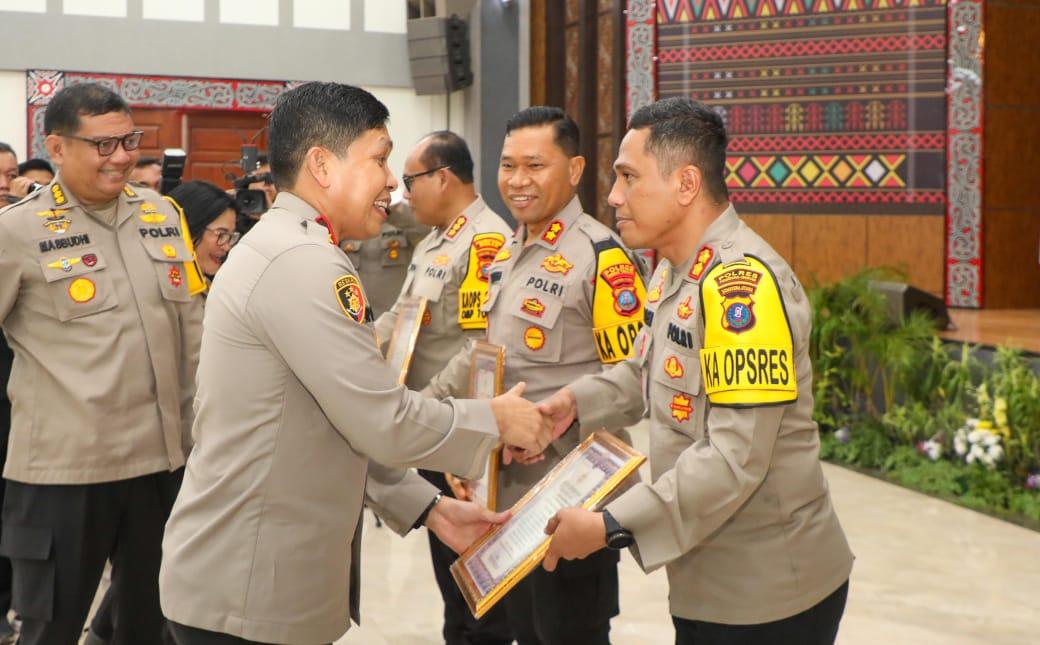 Kapolres Pematangsiantar, AKBP Yogen Heroes Baruno, SH, SIK, menerima penghargaan dari Wakapolda Sumut, Brigjen Pol Rony Samtana, S.I.K, MTCP, di Aul