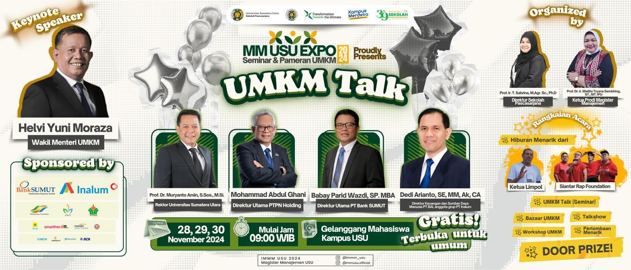 Prof. Dr. Muryanto Amin selaku Rektor USU, yang akan membahas tantangan dan peluang bagi UMKM. Mohammad Abdul Ghani selaku Direktur Utama PTPN Holding, yang akan berbagi pengalaman terkait pengembangan usaha besar yang dapat memberikan inspirasi bagi UMKM.