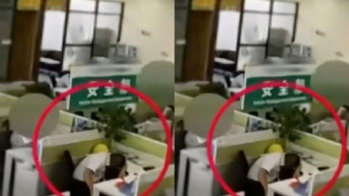 Terlihat Zhang tidur siang di mejanya setelah bekerja keras hingga tengah malam pada malam sebelumnya.
