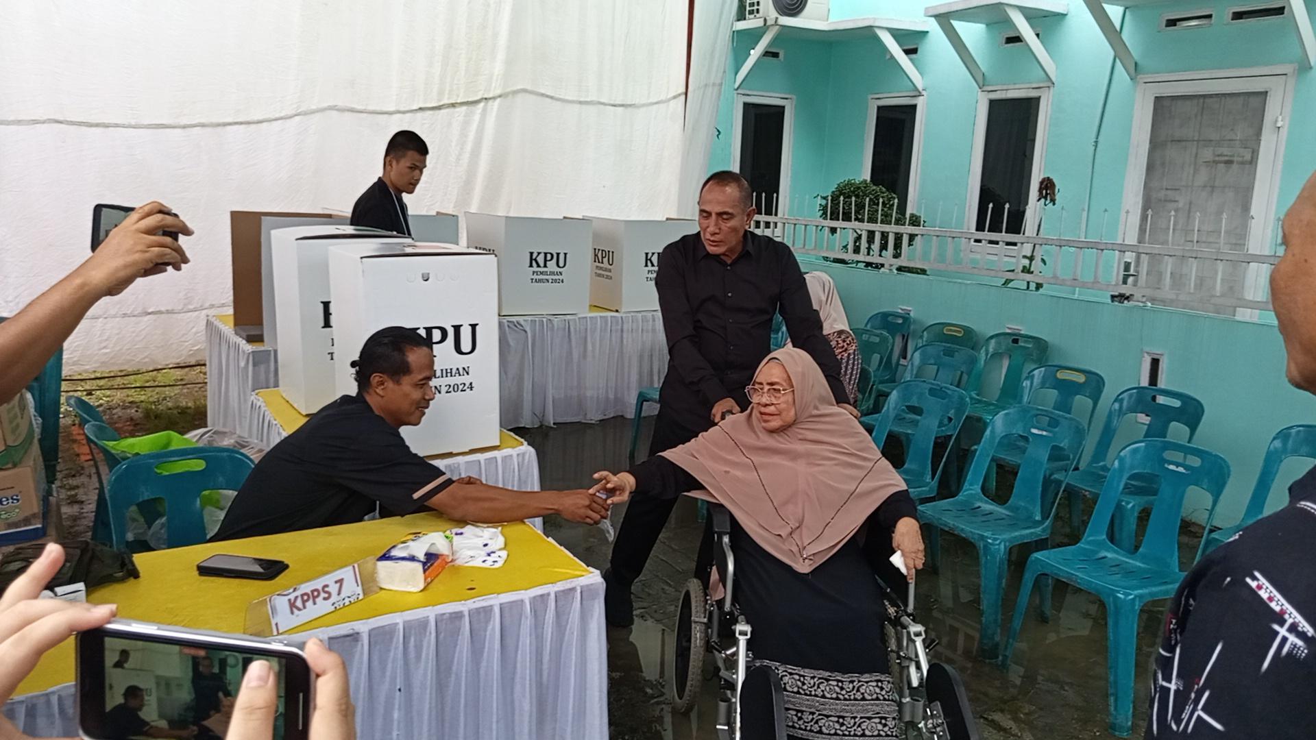 TRIBUN-MEDAN.com, MEDAN- Calon Gubernur Sumatera Utara nomor urut 2, Edy Rahmayadi menuntun ibu kandung yang duduk di kursi roda menuju Tempat Pemungutan Suara. Edy Rahmayadi bersama keluarga mencoblos di TPS 44 Karya Bakti, Medan Johor, Rabu (27/11/2024)