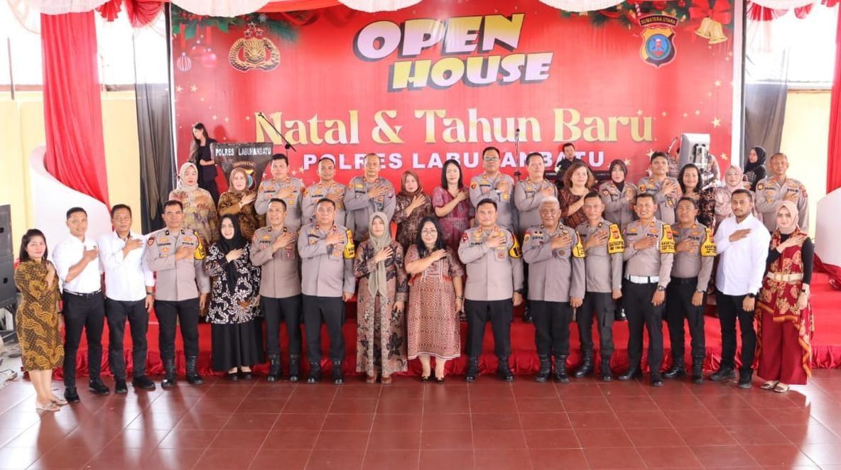 Kapolres Labuhanbatu, AKBP Dr. Bernhard L. Malau, memimpin acara Cooling System Open House dan Syukuran Natal serta Tahun Baru 2025 di Mapolres Labuha