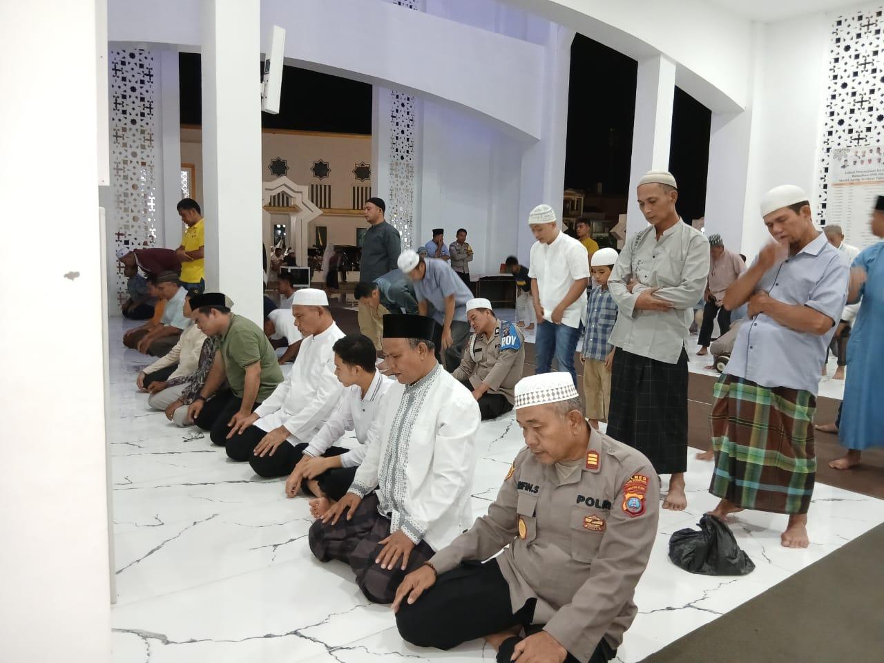 Di antara mereka, 36 personel Polres Padangsidimpuan turut hadir, mengenakan peci dan sarung, bersiap untuk melaksanakan sholat Isya dan Tarawih berjamaah.