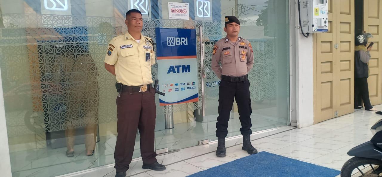 Petugas Sat Pam Obvit berjaga di depan kantor bank, sementara personel Sat Sabhara Polres Samosir melakukan patroli untuk memastikan keamanan