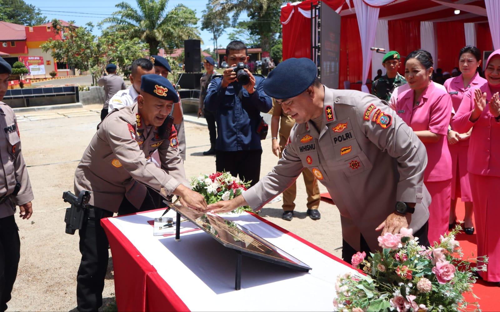 Didampingi Dansat Brimob Polda Sumut Kombes Pol Rantau Isnur Eka, Kapolda Sumut, Irjen Pol. Whisnu Hermawan, menandatangani prasasti peresmian Masjid