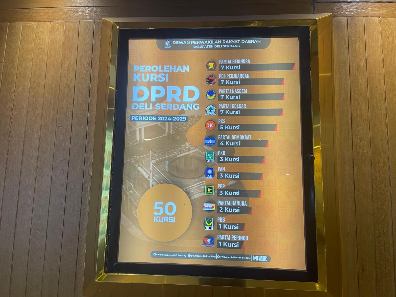 JUMLAH KURSI : Papan informasi berisi jumlah kursi Parpol yang terpajang di kantor DPRD Deli Serdang, Rabu (25/6/2025). Saat ini Parpol menunggu pencairan dana hibah Parpol dari Pemkab Deli Serdang.