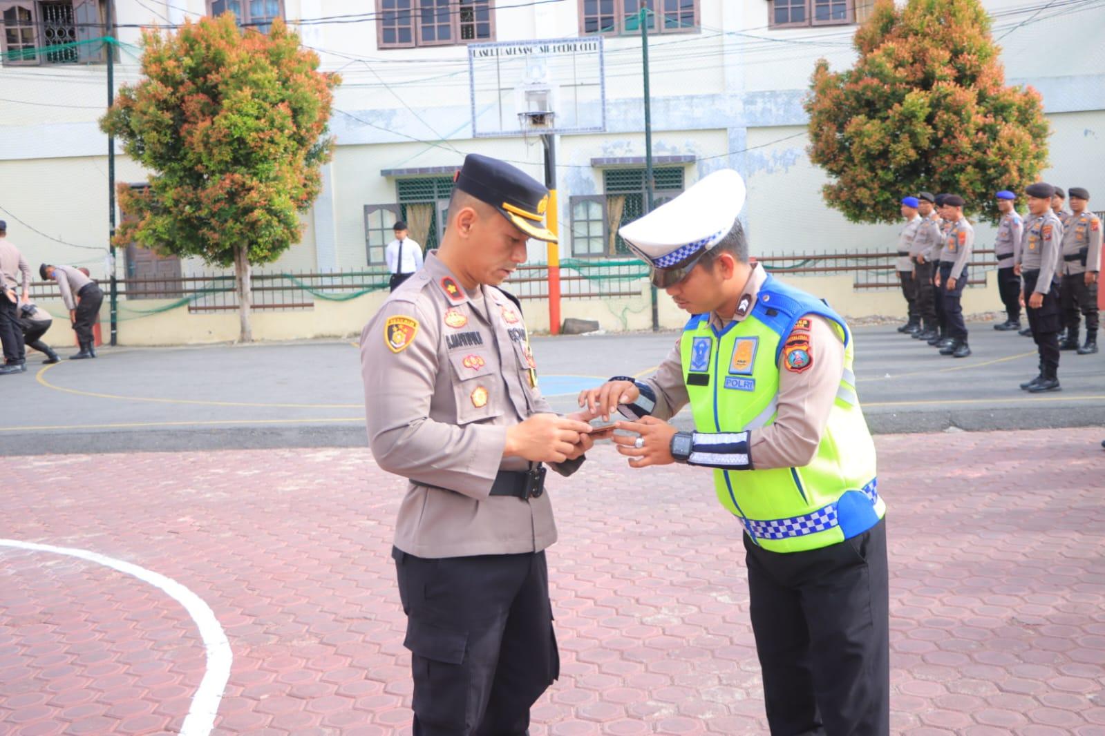 Seluruh personel dari satuan Polres dan jajaran Polsek dibagi ke dalam empat barisan untuk mengikuti rangkaian pemeriksaan rutin.