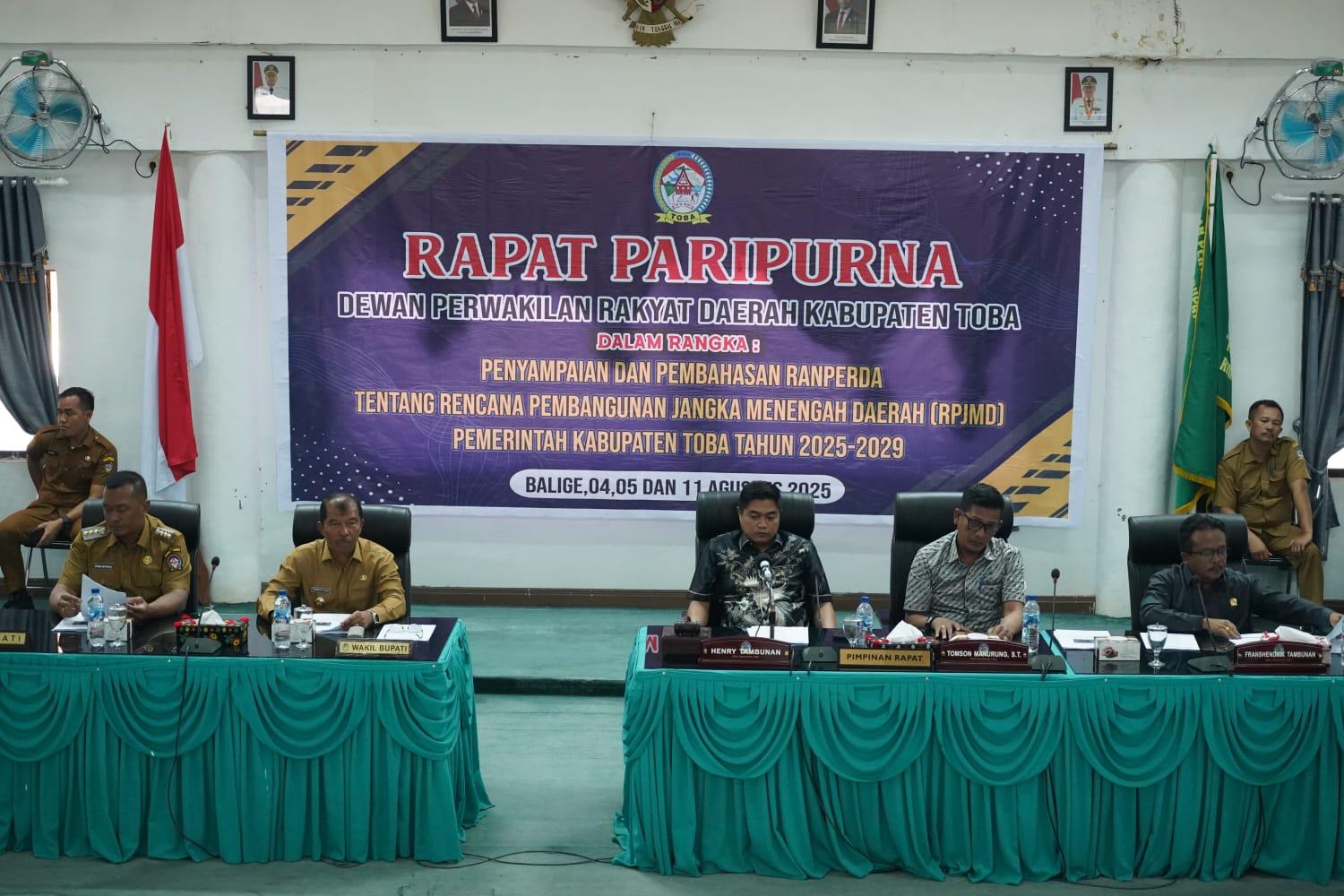 TRIBUN-MEDAN.com, TOBA - Fraksi Fraksi di DPRD Kabupaten Toba menyampaikan masukan dan saran pada Rapat Paripurna Tentang Ranperda Rencana Pembangunan Jangka Menengah Daerah (RPJMD) Kabupaten Toba Tahun 2025-2029 dengan agenda pandangan umum fraksi di gedung DPRD Kabupaten Toba pada Selasa (5/8/2025).