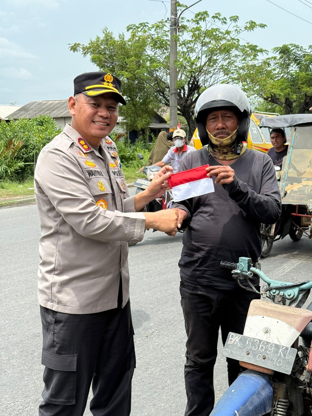 Dipimpin langsung Kapolres Pelabuhan Belawan AKBP Wahyudi Rahman, SH., SIK., MM., CPHR., CBA didampingi Wakapolres Kompol Dedy Dharma, para personel turun ke jalan untuk mengajak warga turut serta mengibarkan bendera.