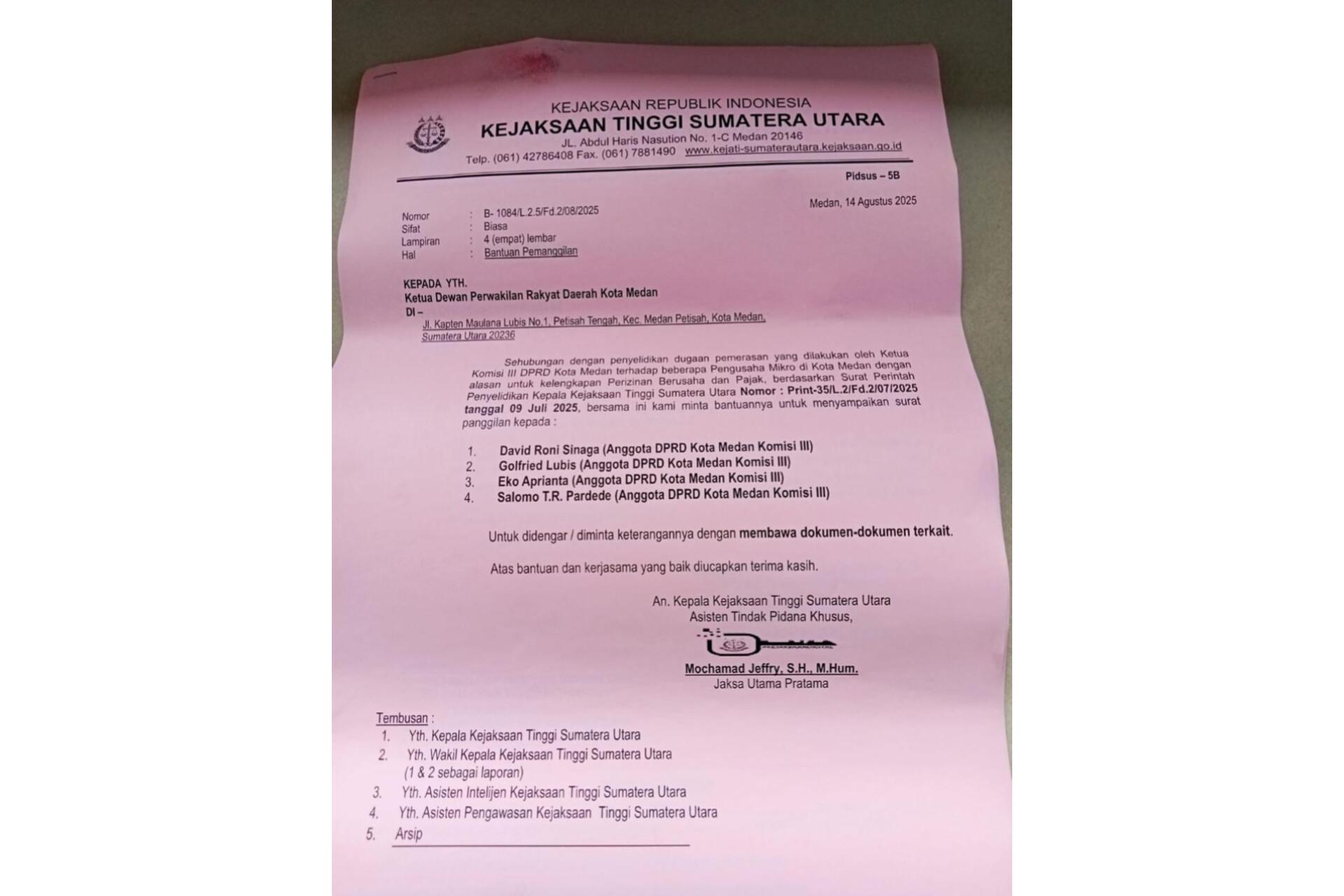 Pemanggilan tersebut berdasarkan surat Kejatisu Surat degan nomor B-1084/L.2.5/Fd.2/08/2025 ditujukan kepada Ketua DPRD Kota Medan tertanggal 14 Agustus 2025.