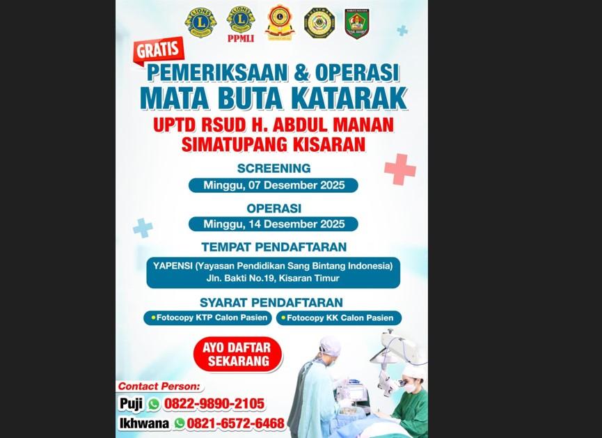 | Pemkab Asahan Adakan Operasi Katarak Gratis di RSUD Kisaran pada 14 Desember 2025 |